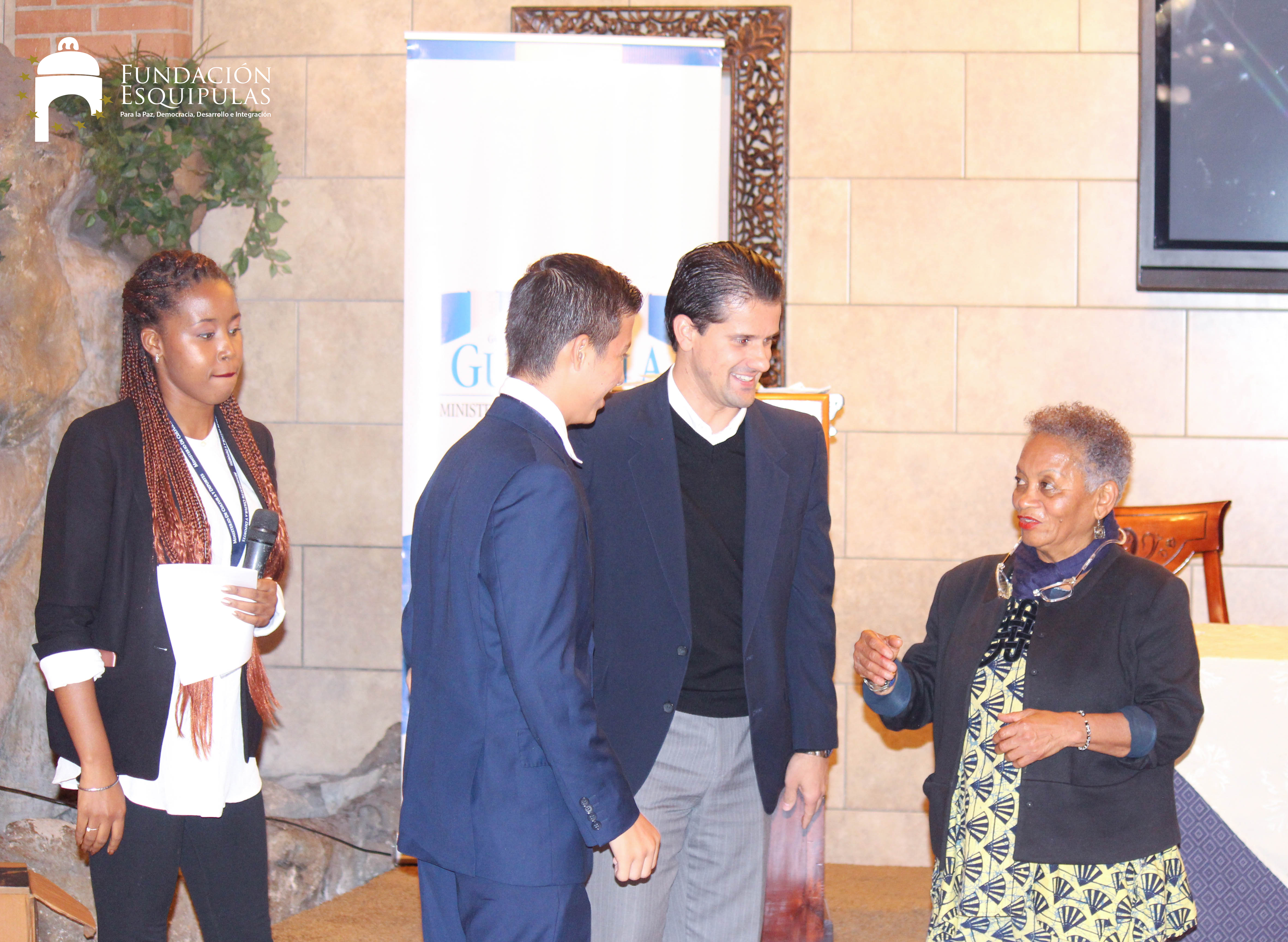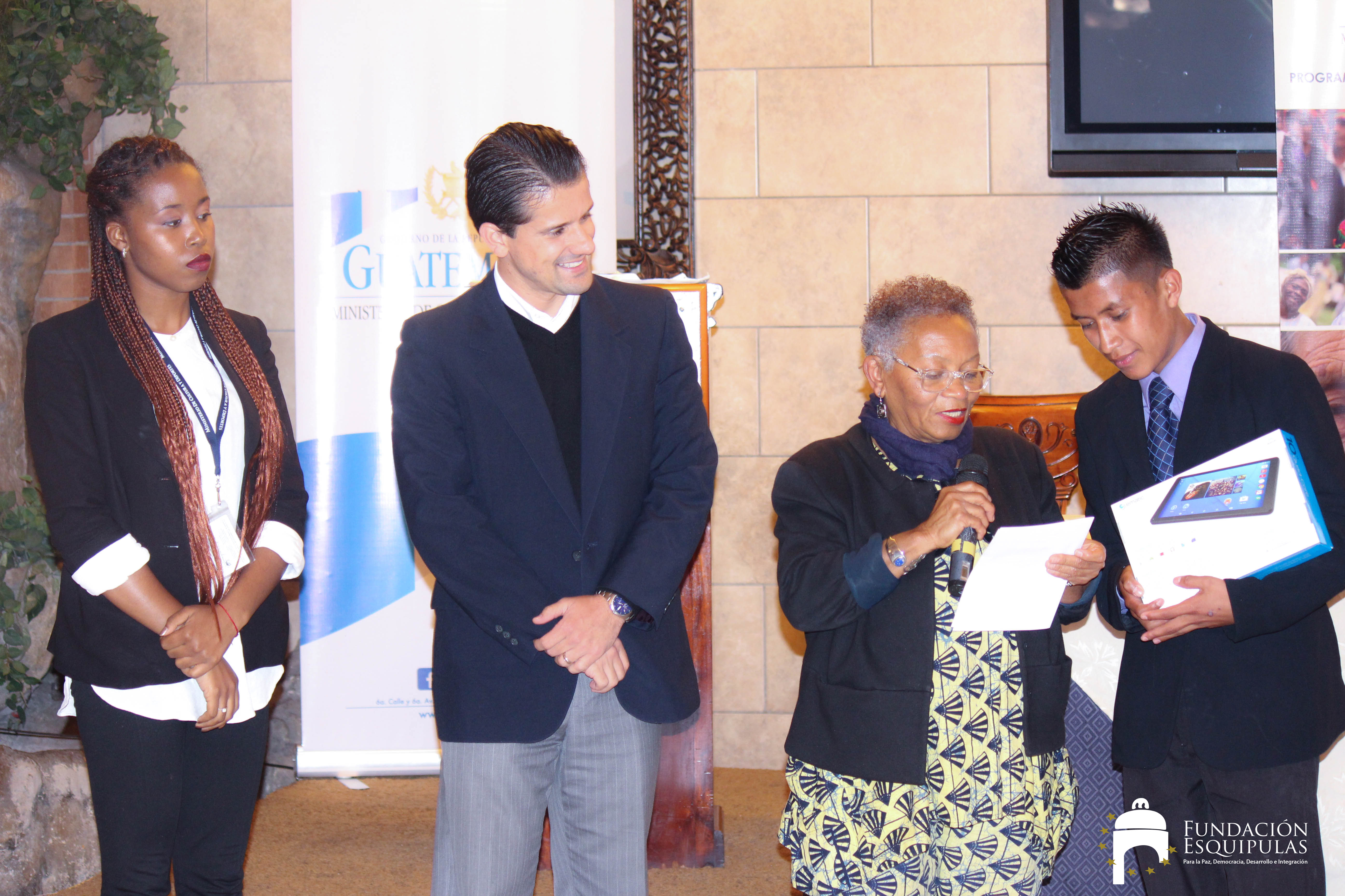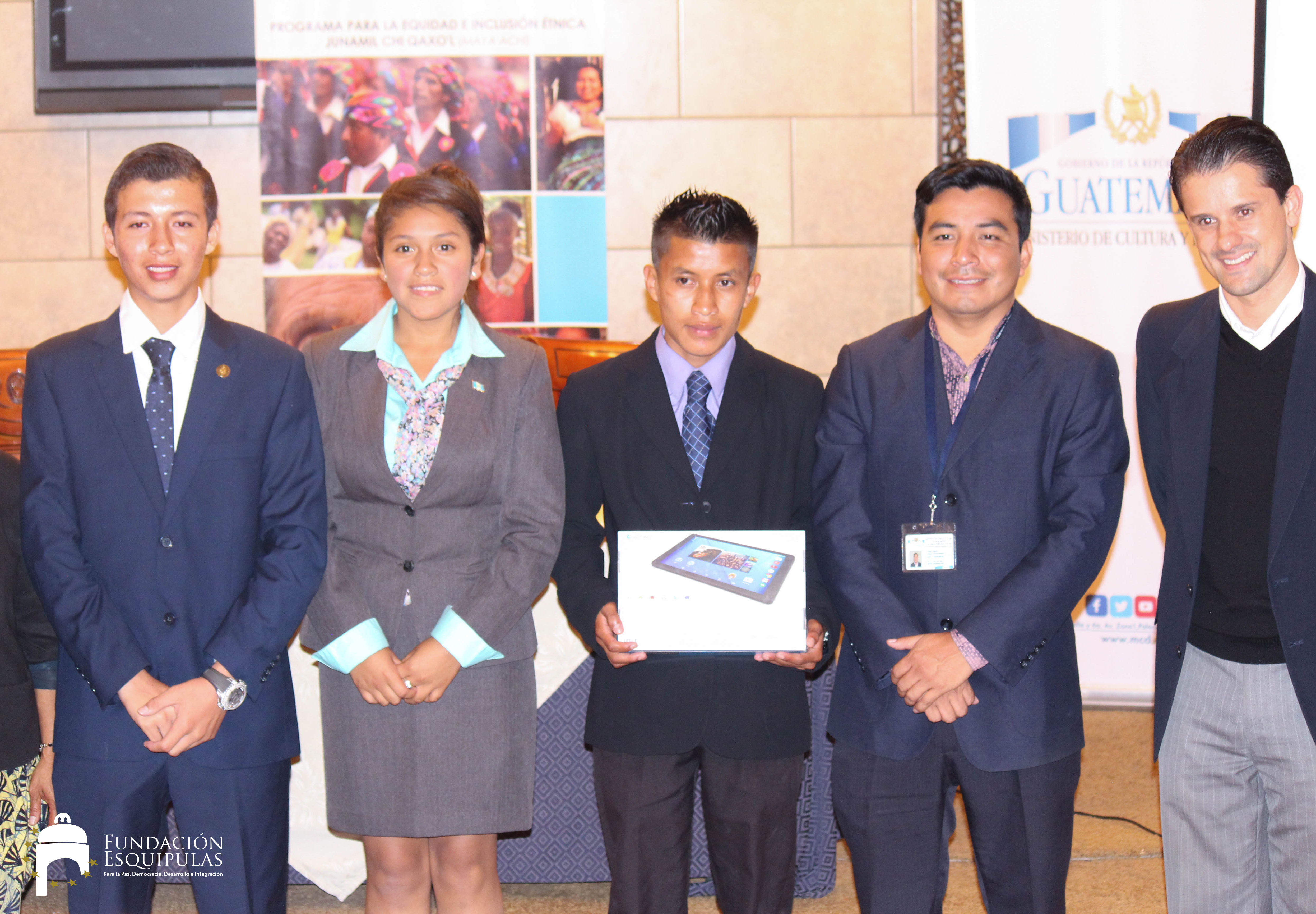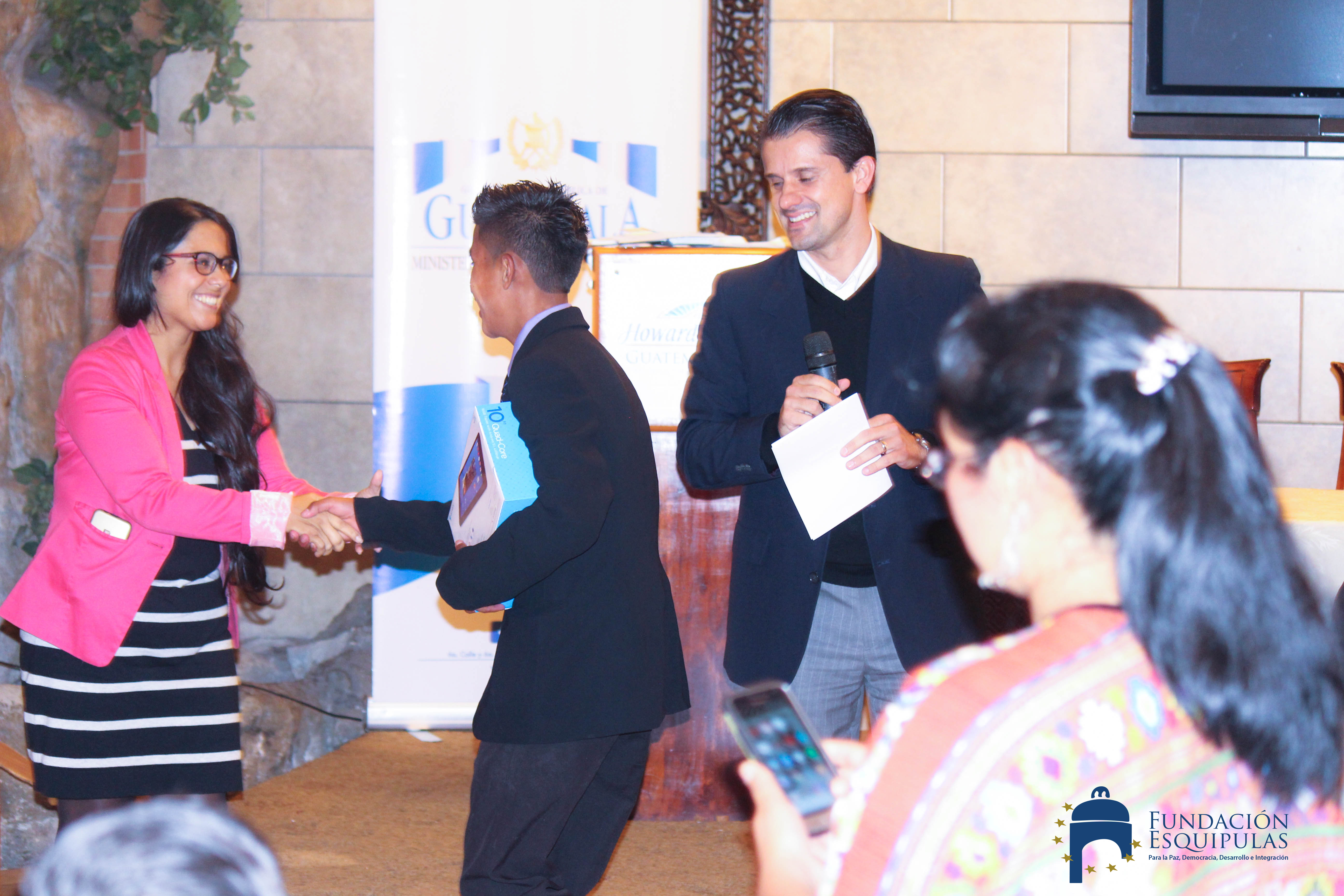 Los ganadores del concurso nacional fueron premiados por las autoridades de Fundación Esquipulas, Lic. Jorge Raúl Cruz, Director Ejecutivo y Licda. Ingrid Morales, Sub Directora realizaron la entrega de premios a los ganadores de los tres primeros lugares: 1er lugar Marlon Alexi GarcÃa, de la Escuela Nacional de Ciencias Comerciales Encieco-Poptún, Petén; 2do. Lugar Ruth Sarai Cisneros, Colegio Sagrada Familia, Jalapa; 3er. Lugar Herber Magnoly Morán, Instituto de Educación Básica por Cooperativa Pajuil, Quiché.